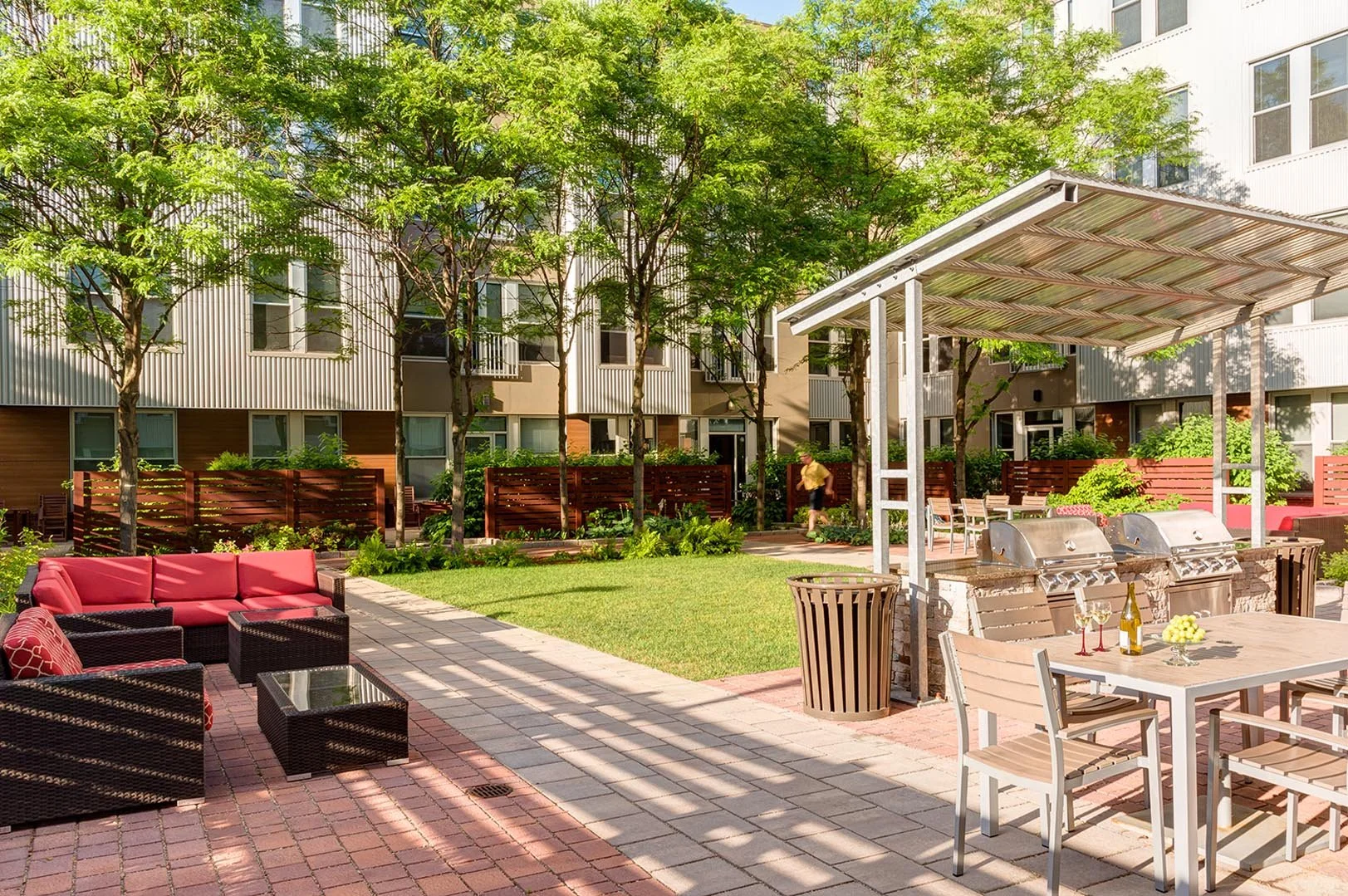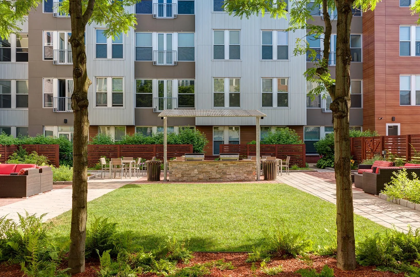 The owner of this large multi-unit apartment building in Cambridge, MA wanted to freshen up their amenity courtyard and activate the space in order be more competitive with other Boston area complexes. We are creating a series of connected outdoor living rooms with new permeable paving, landscaping, lighting, fencing for security and screening, grilling stations, and high end moveable seating and dining tables. Preserving mature existing Honeylocust trees became a priority and a challenge.