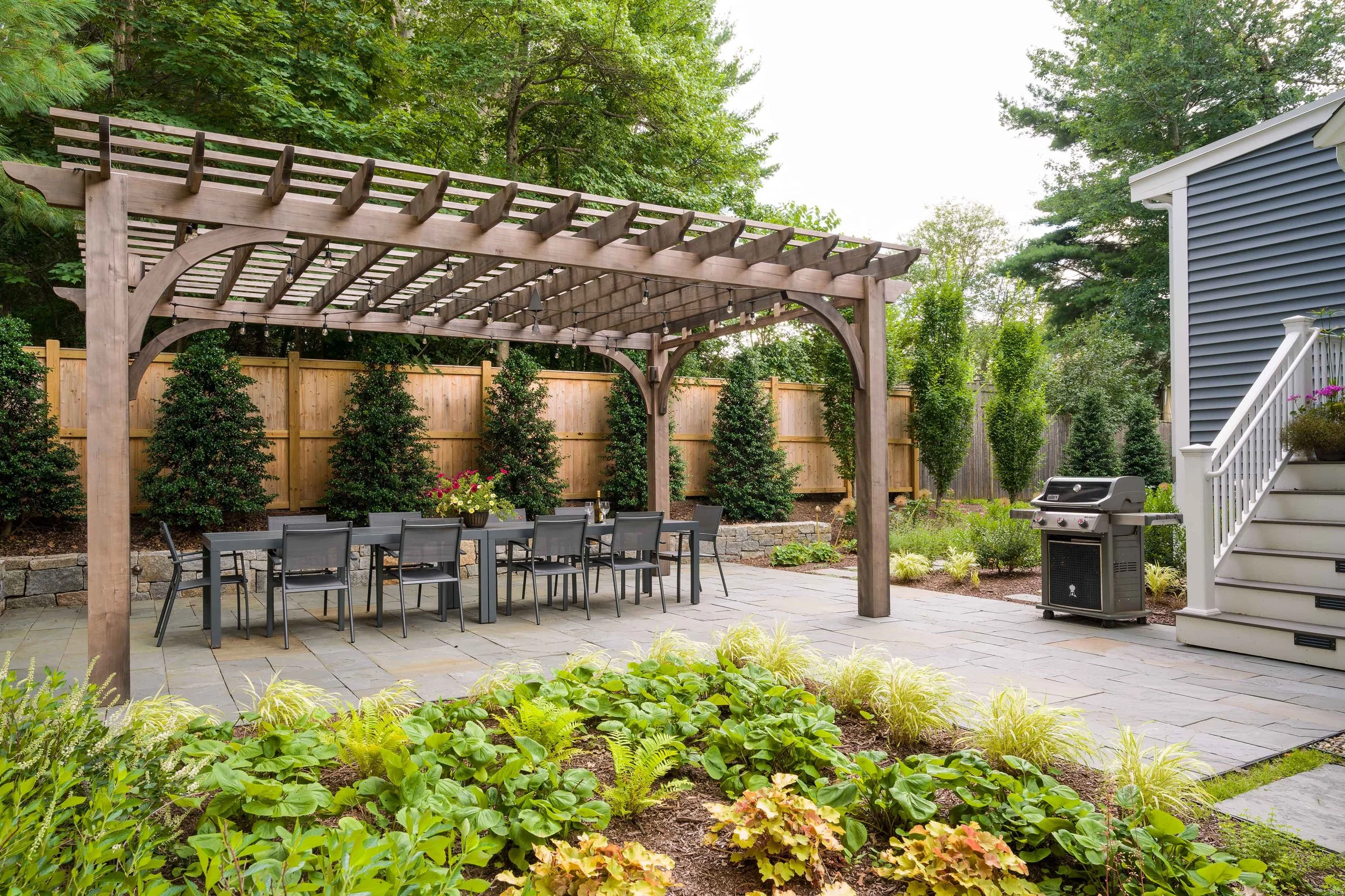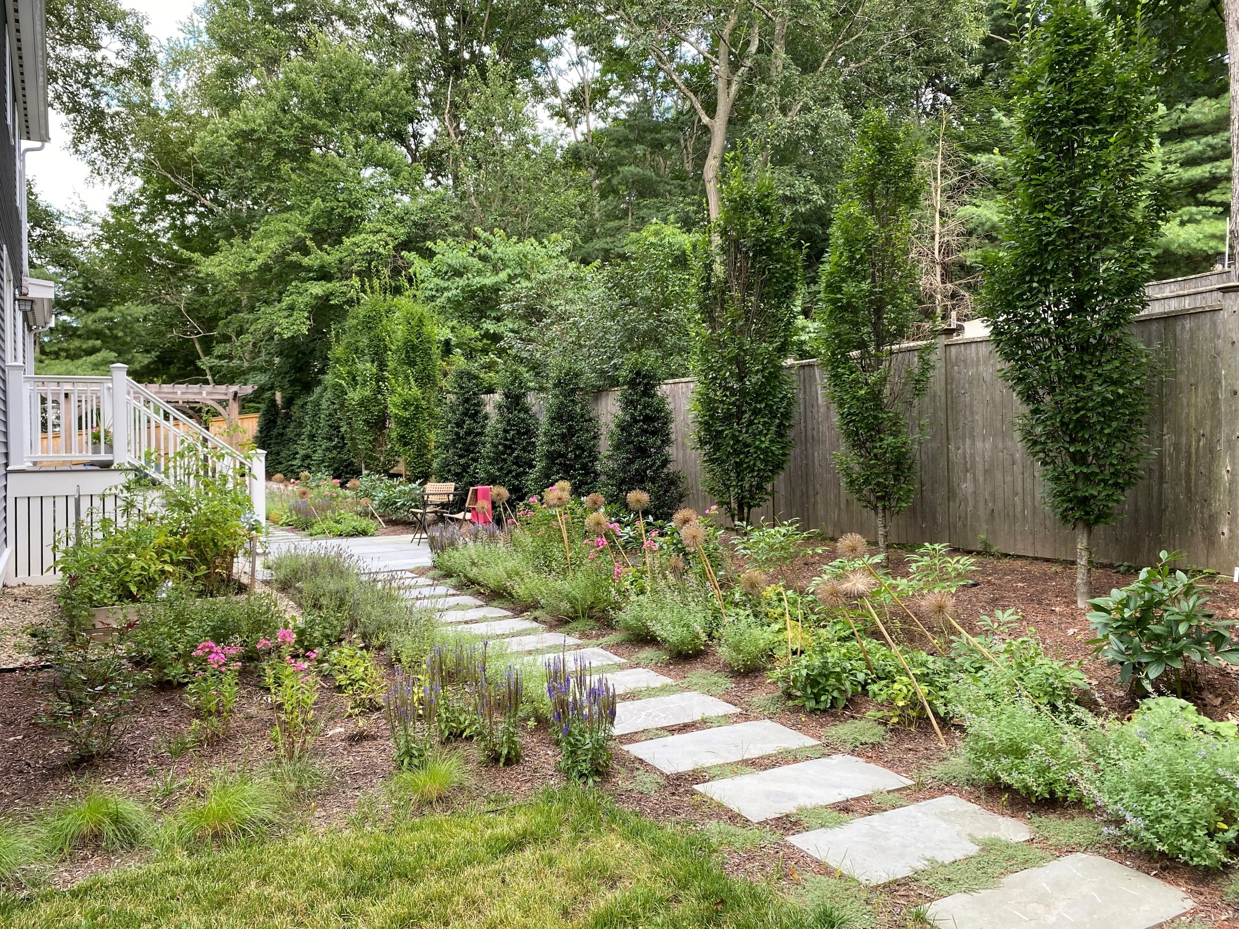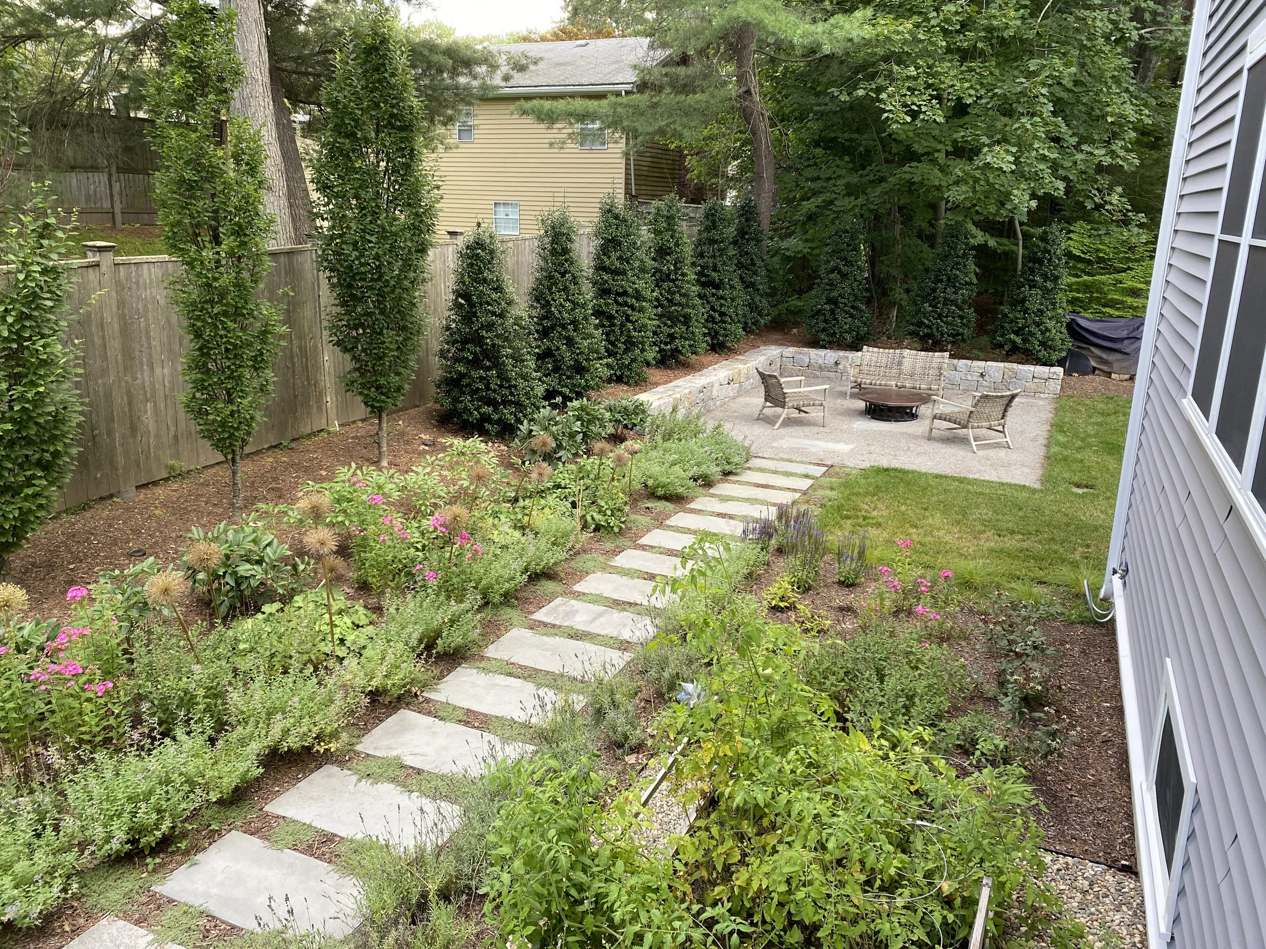 This project presented the challenge of converting the narrow backyard of a recently built home into a multi-function social and gathering space, which also incorporated the owner’s passion for vegetable and flowering gardening, plus an open lawn space for the kids to play. Natural fieldstone seatwalls and bluestone paving provide New England authenticity and an air of informality. Careful consideration of the views from the kitchen and family room toward the neighbors influenced tree placement.
