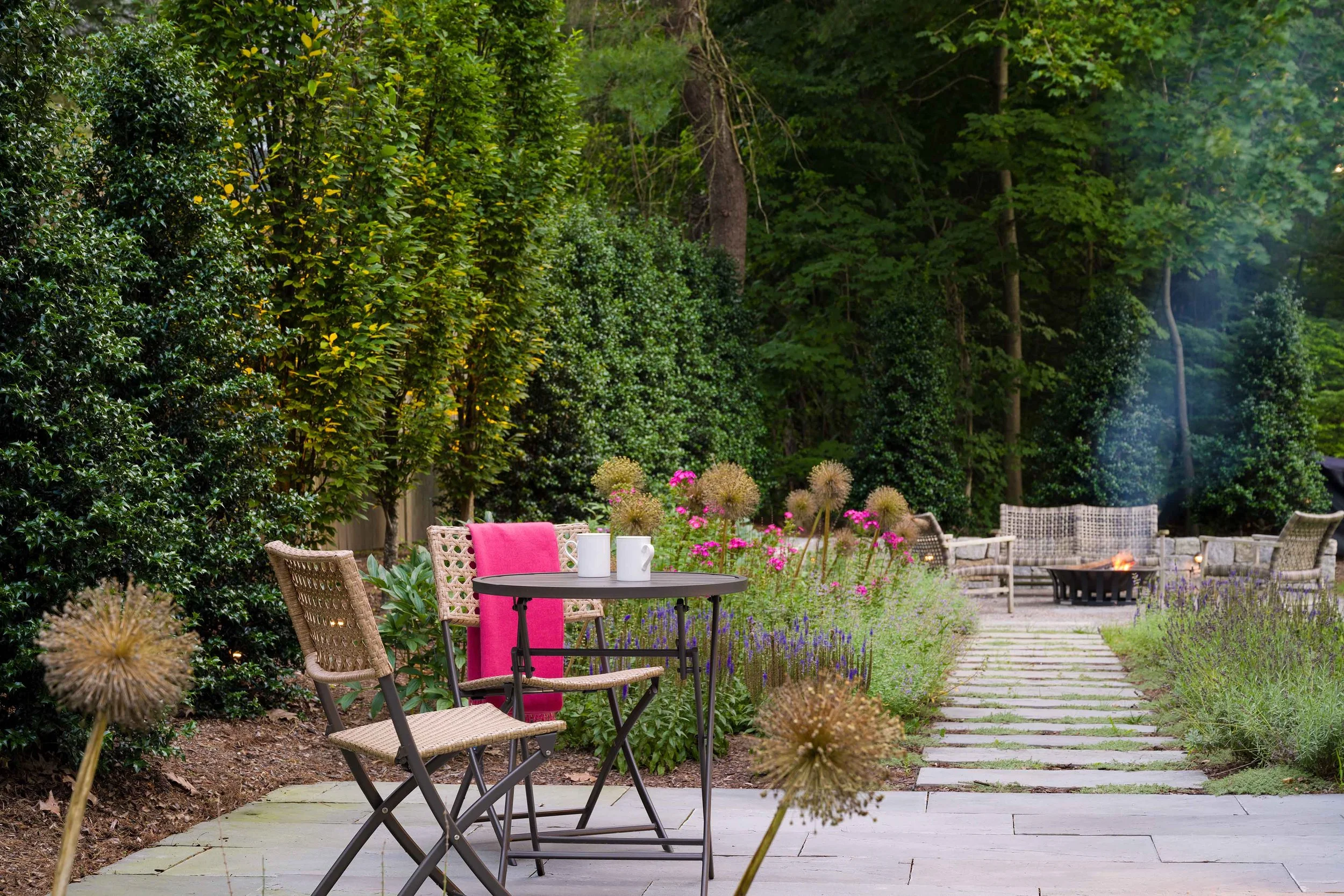 The planting palette was designed with an emphasis on colorful perennials and interesting foliage for year-round interest.